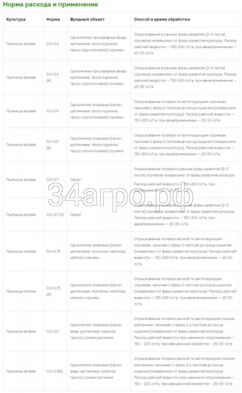 Опрыскивание посевов весной по вегетирующим сорнякам, начиная с фазы 2 листьев до конца кущения (независимо от фазы развития культуры). Расход рабочей жидкости – 150-200 л/га, при авиаприменении – 25-50 л/га